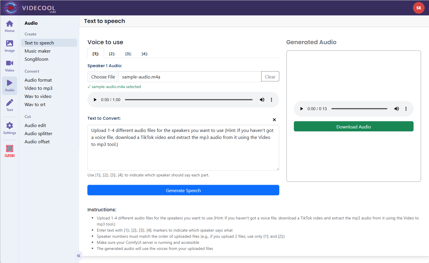 Videcool integrates seamlessly with ComfyUI, allowing users to clone voices and generate speech directly without managing the underlying node graph. After importing the workflow file, simply select a reference audio file, enter your text, and click generate. The system handles all backend interactions with ComfyUI. This makes voice cloning intuitive and accessible, even for users who are not keen on learning how ComfyUI works. The following video shows how this model can be used in Videcool:
