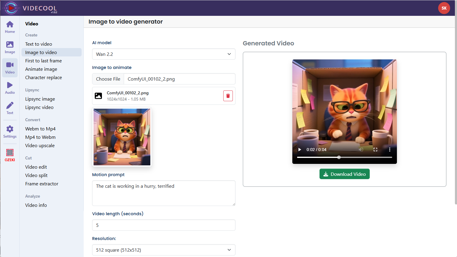 Step 14: Open Videcool in your browser, select image to video, and choose WAN 2.2 to generate a video.