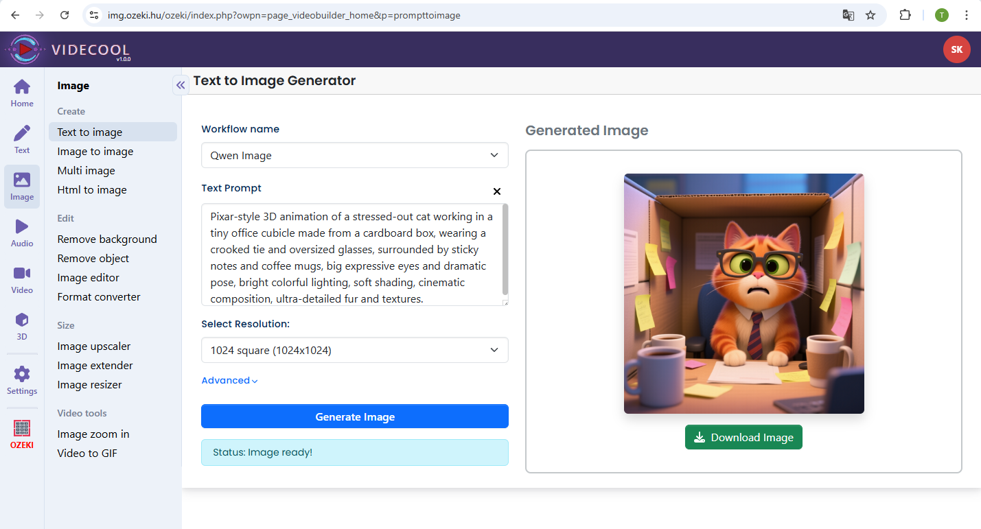 Step 9: Open Videcool in your browser, select text to image, and choose Flux1-Dev to generate an image