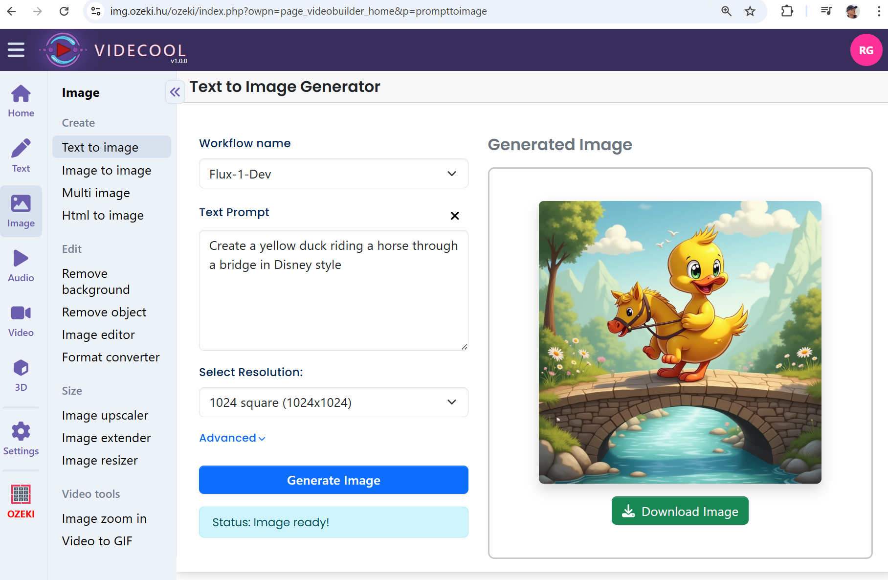 Step 10: Open Videcool in your browser, select text to image, and choose Flux1-Dev to generate an image