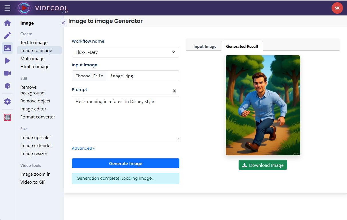 Step 12: Open Videcool in your browser, select the Flux Kontext image edit tool, and use the generated outputs directly inside your video or image projects.