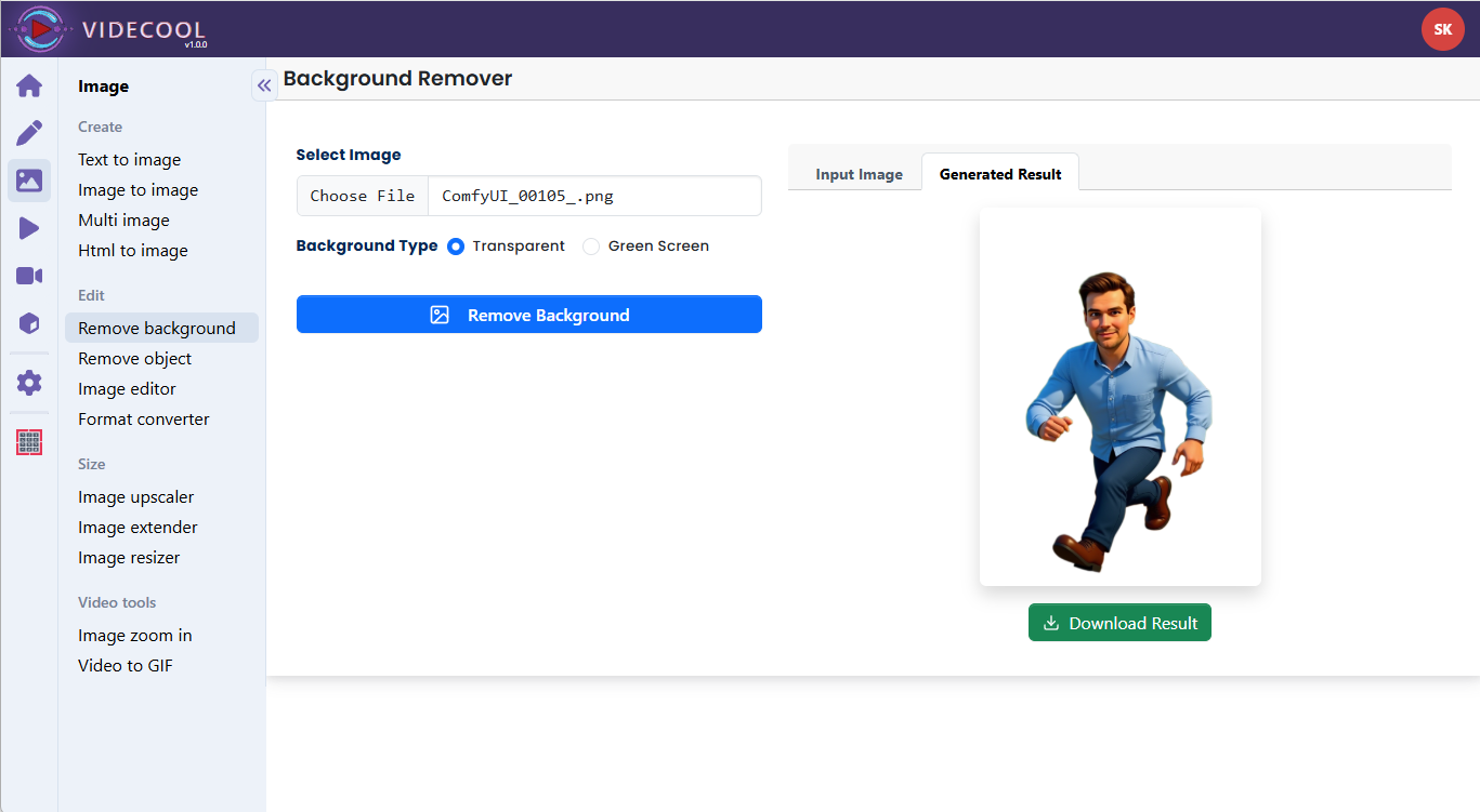 The AI Background Remove workflow in Videcool provides a powerful and flexible way to separate foreground subjects from their backgrounds in images. Designed for speed, accuracy, and clean cutouts, this workflow is served by ComfyUI and uses the ComfyUI-RMBG background removal model as a custom node.