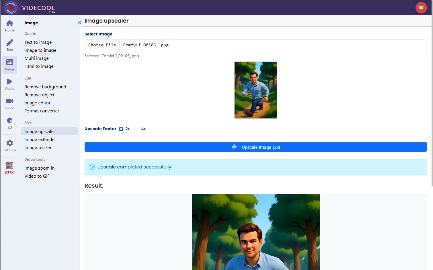 Step 10: Open Videcool in your browser and use the AI Image Upscale tool to apply these workflows to images in your projects.