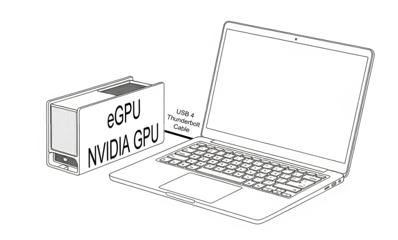 The third option is to use an eGPU attached to your laptop. An eGPU is an external GPU unit, that is connected to a laptop via an USB4/Thunderbolt cable. It is a simple case for a standard NVIDIA GPU card with an external power supply.